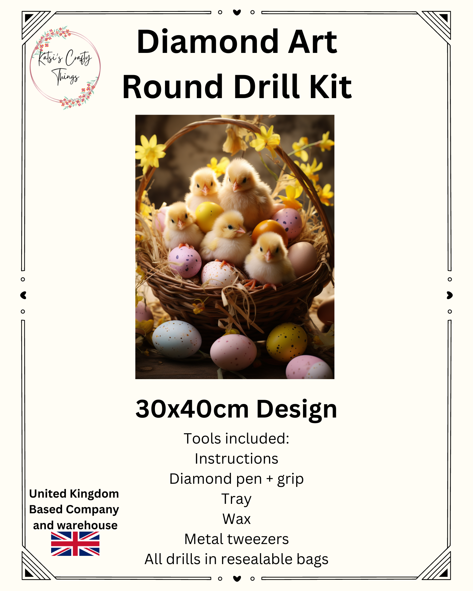 Full drill round diamond painting 30 x 40cm Included 1 x canvas Round diamonds Pen/Tray/Wax Transform a blank canvas into a stunning work of art with this Diamond Painting kit! With everything you need to get started, including high-quality round diamonds and essential tools, you'll have the perfect way to relax and express your creativity. And at 30 x 40cm, this project is the perfect size to display and admire. Let your inner artist shine with Diamond Painting - Realistic Spring Chicks!