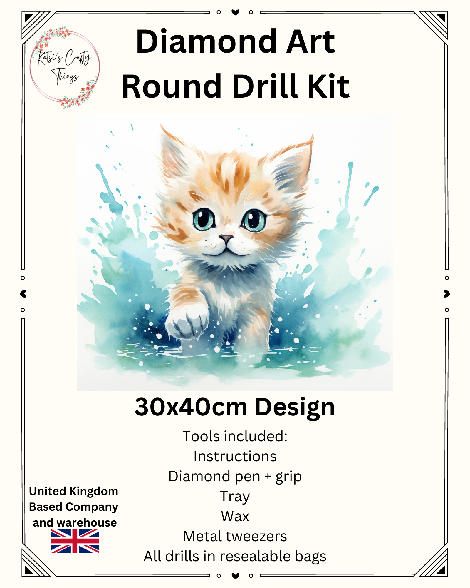 Full drill round diamond painting 30 x 40cm Included 1 x canvas Round diamonds Pen/Tray/Wax Transform a blank canvas into a stunning work of art with this Diamond Painting kit! With everything you need to get started, including high-quality round diamonds and essential tools, you'll have the perfect way to relax and express your creativity. And at 30 x 40cm, this project is the perfect size to display and admire. Let your inner artist shine with Diamond Painting - Watercolour Kitten Blue Splash!