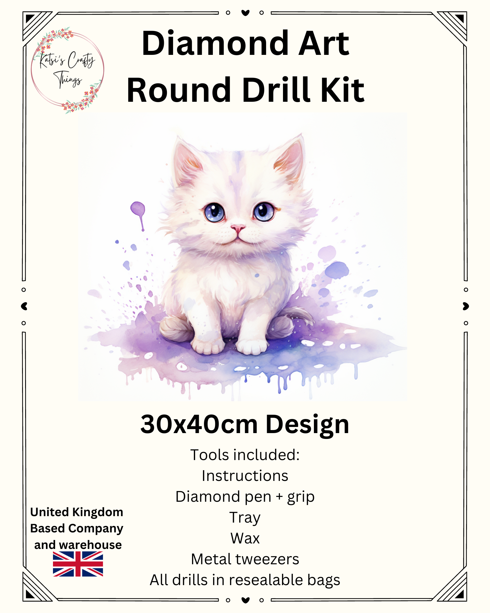 Full drill round diamond painting 30 x 40cm Included 1 x canvas Round diamonds Pen/Tray/Wax Transform a blank canvas into a stunning work of art with this Diamond Painting kit! With everything you need to get started, including high-quality round diamonds and essential tools, you'll have the perfect way to relax and express your creativity. And at 30 x 40cm, this project is the perfect size to display and admire. Let your inner artist shine with Diamond Painting - Watercolour Kitten Lilac Splash!