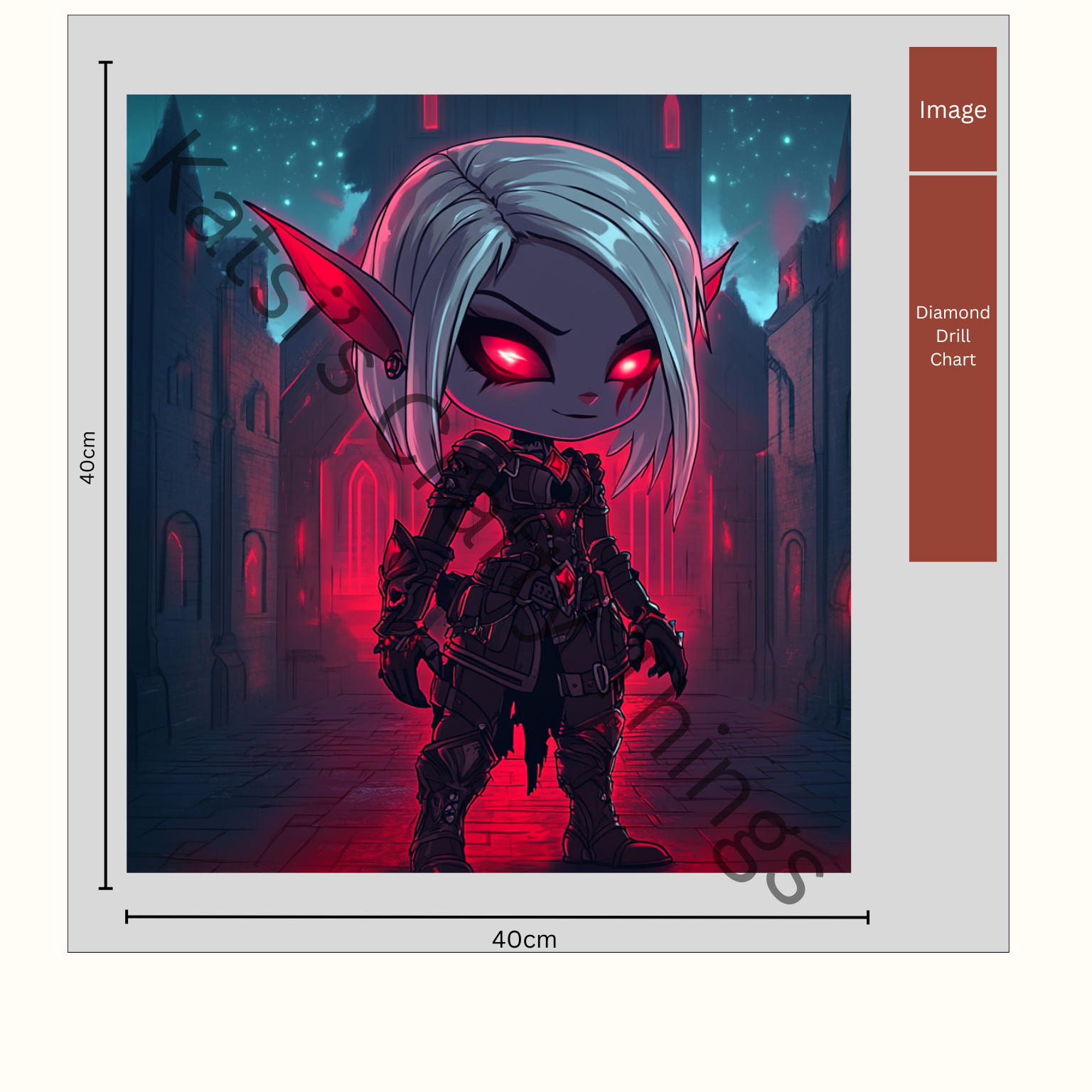 This is designed by Katsi's Crafty Things. All of our kits contain a tool kit including tray, pen, tweezers and wax, all of the diamonds (plus extra), and a true to size canvas using poured glue.
