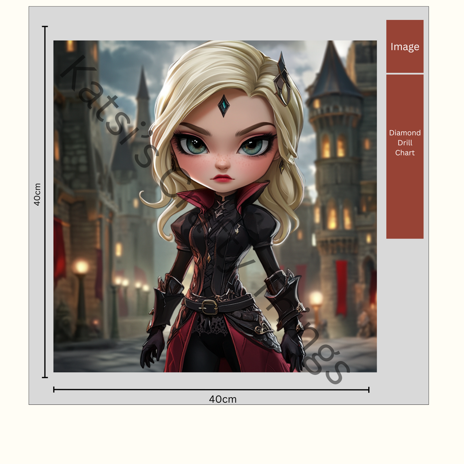 This is designed by Katsi's Crafty Things. All of our kits contain a tool kit including tray, pen, tweezers and wax, all of the diamonds (plus extra), and a true to size canvas using poured glue.