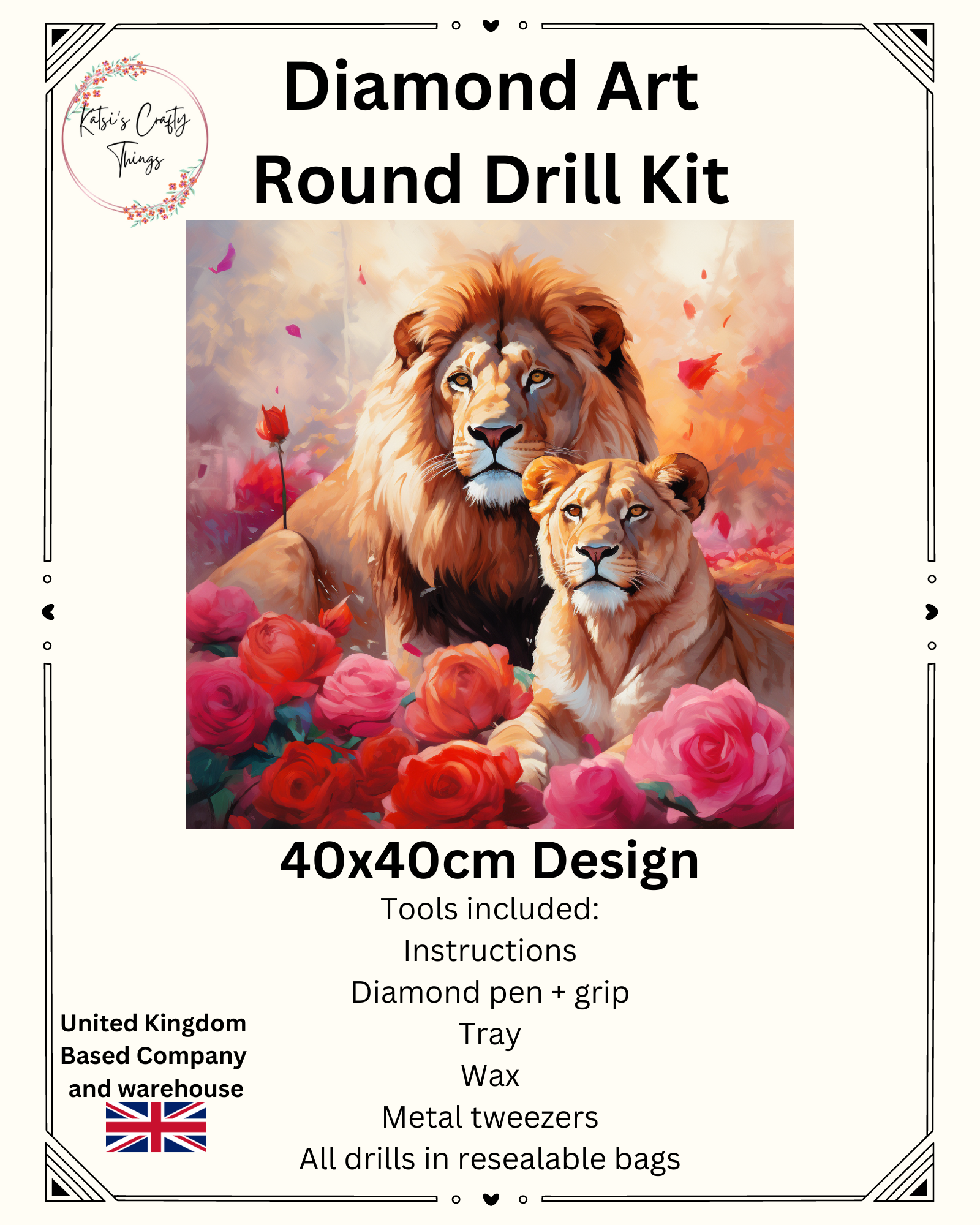 Full drill round diamond painting 40 x 40cm Included 1 x canvas Round diamonds Pen/Tray/Wax Transform a blank canvas into a stunning work of art with this Diamond Painting kit! With everything you need to get started, including high-quality round diamonds and essential tools, you'll have the perfect way to relax and express your creativity. And at 40 x 40cm, this project is the perfect size to display and admire. Let your inner artist shine with Diamond Painting - Lions in Roses!