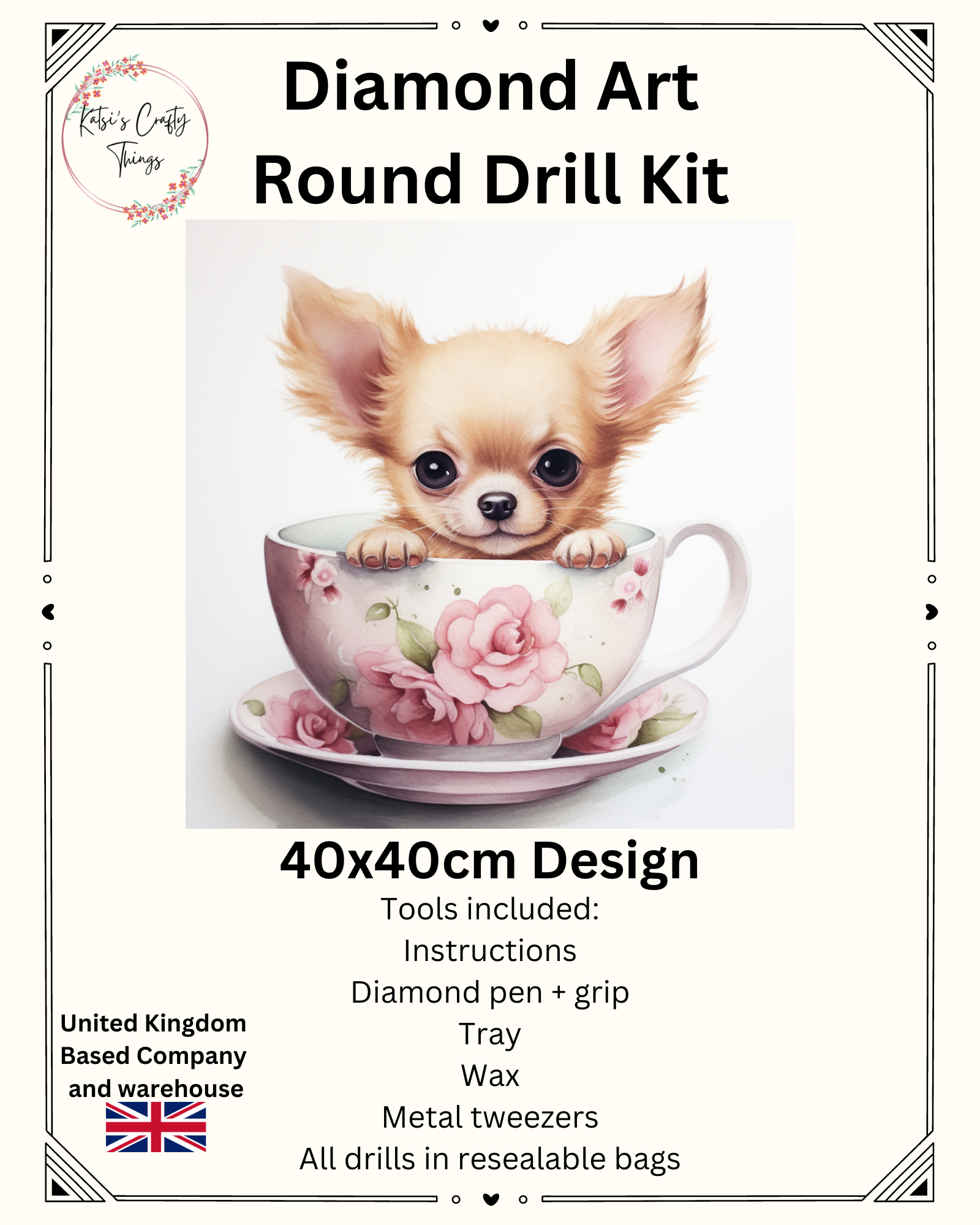 Transform your space with our stunning Diamond Painting featuring a charming Tea cup Chihuahua. This 40x40cm canvas is the perfect addition to your home decor, adding a touch of elegance and warmth. Let the sparkling diamonds and adorable design inspire you and bring joy to your daily life!