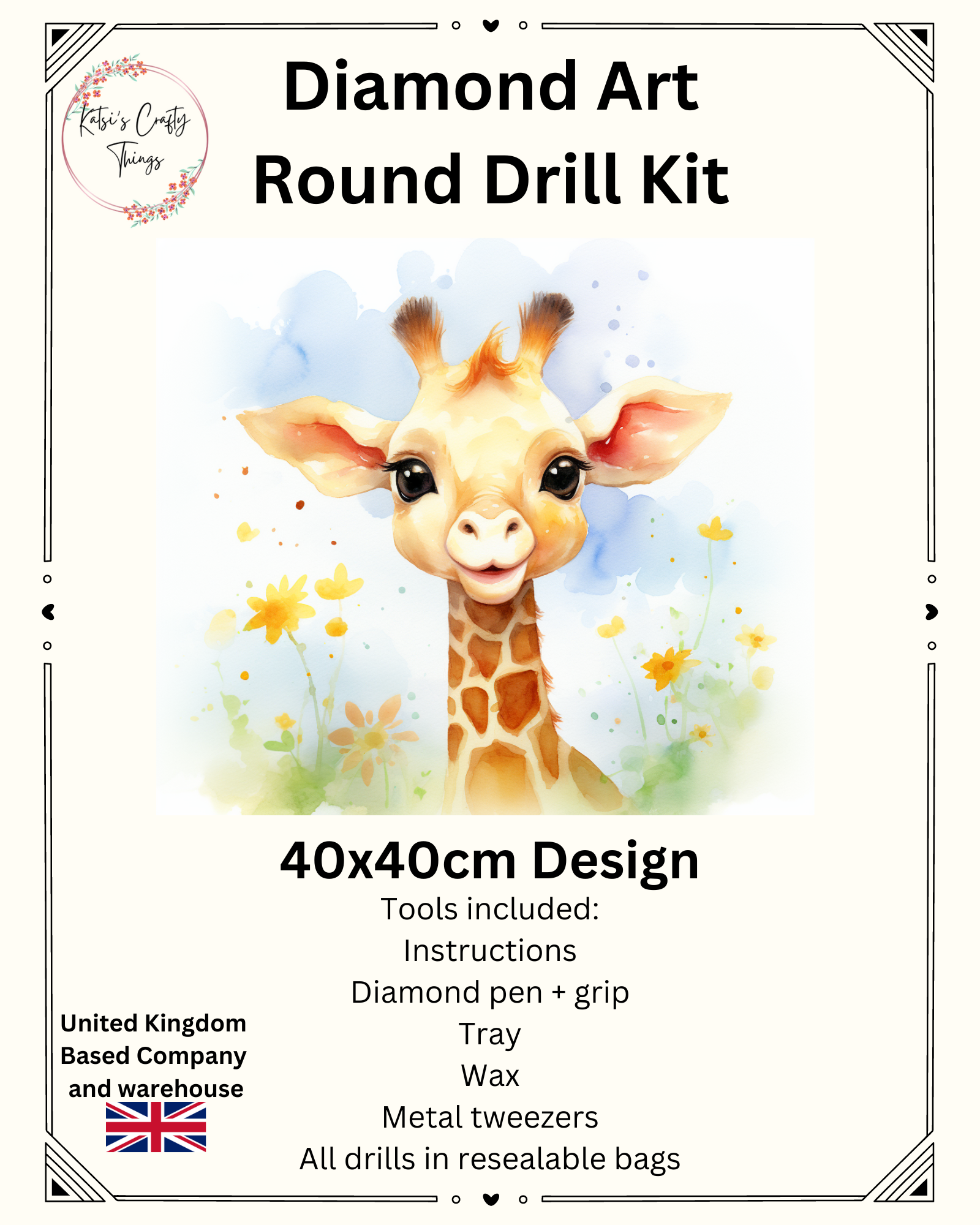 Full drill round diamond painting 40 x 40cm Included 1 x canvas Round diamonds Pen/Tray/Wax Transform a blank canvas into a stunning work of art with this Diamond Painting kit! With everything you need to get started, including high-quality round diamonds and essential tools, you'll have the perfect way to relax and express your creativity. And at 40 x 40cm, this project is the perfect size to display and admire. Let your inner artist shine with Diamond Painting - Watercolour Baby Giraffe!