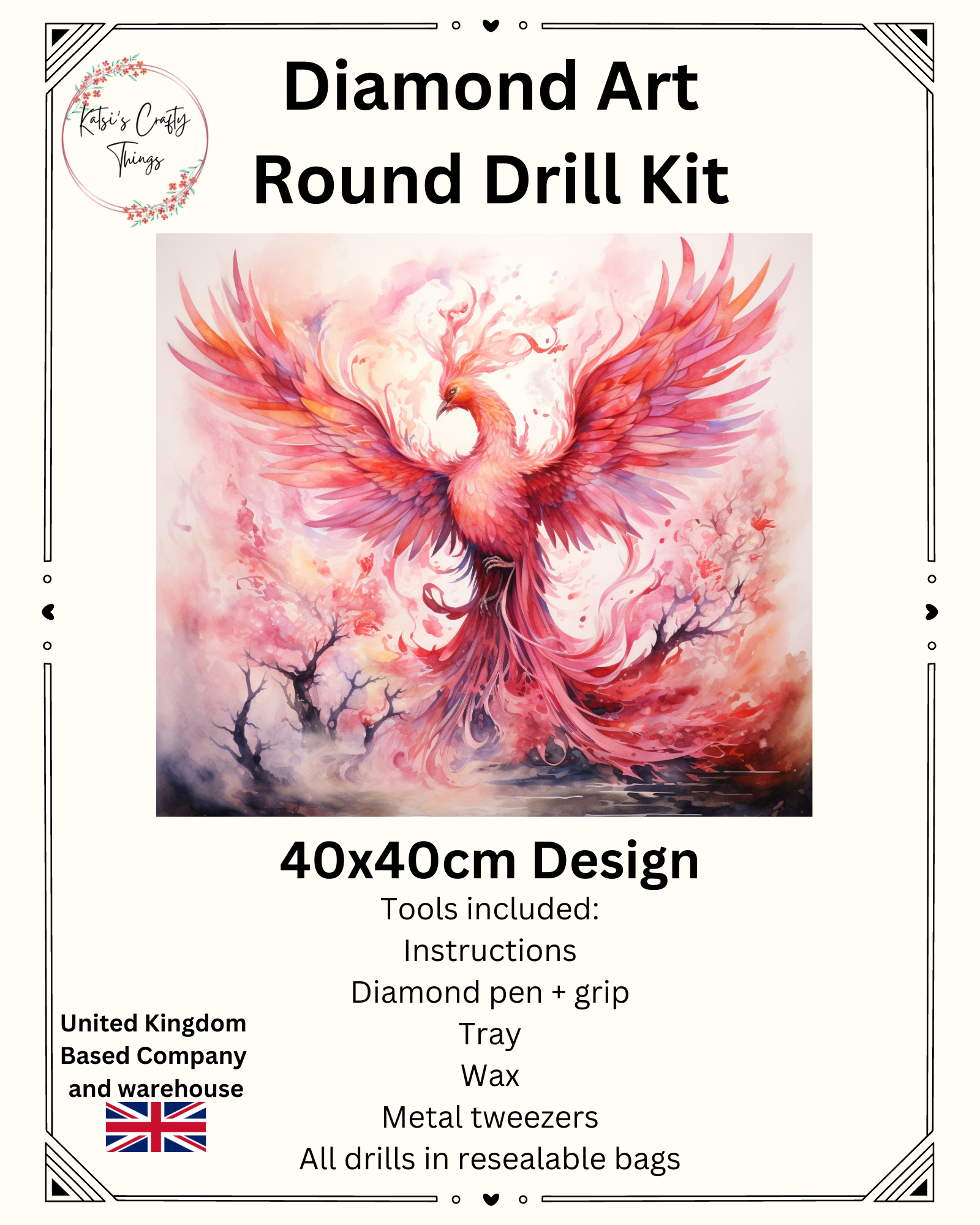 Full drill round diamond painting 40 x 40cm Included 1 x canvas Round diamonds Pen/Tray/Wax Transform a blank canvas into a stunning work of art with this Diamond Painting kit! With everything you need to get started, including high-quality round diamonds and essential tools, you'll have the perfect way to relax and express your creativity. And at 40 x 40cm, this project is the perfect size to display and admire. Let your inner artist shine with Diamond Painting - Watercolour Phoenix!