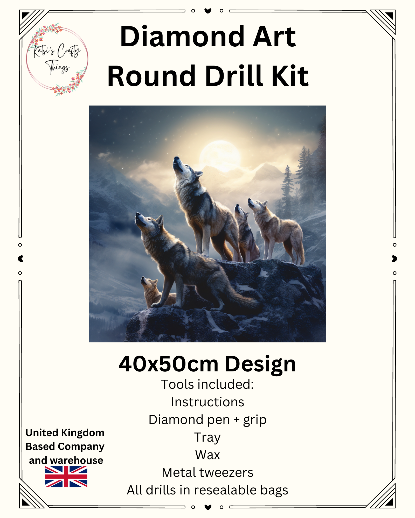 Discover the magic of Diamond Painting with our howling wolf pack 40x50cm kit! This complete set includes a 1 x canvas, round diamonds, and all necessary tools (pen, tray, and wax) to create a stunning full drill round diamond painting. Unleash your creativity!