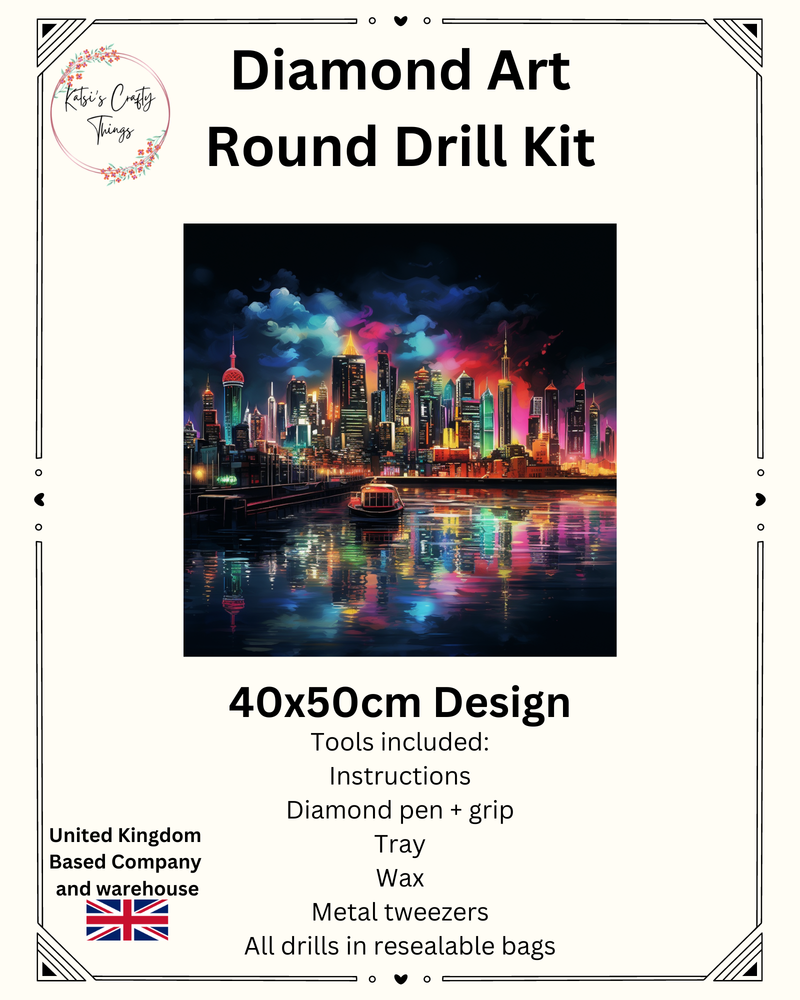 Discover the magic of Diamond Painting with our Neon Skyline 40x50cm kit! This complete set includes a 1 x canvas, round diamonds, and all necessary tools (pen, tray, and wax) to create a stunning full drill round diamond painting. Unleash your creativity and bring this vibrant cityscape to life!