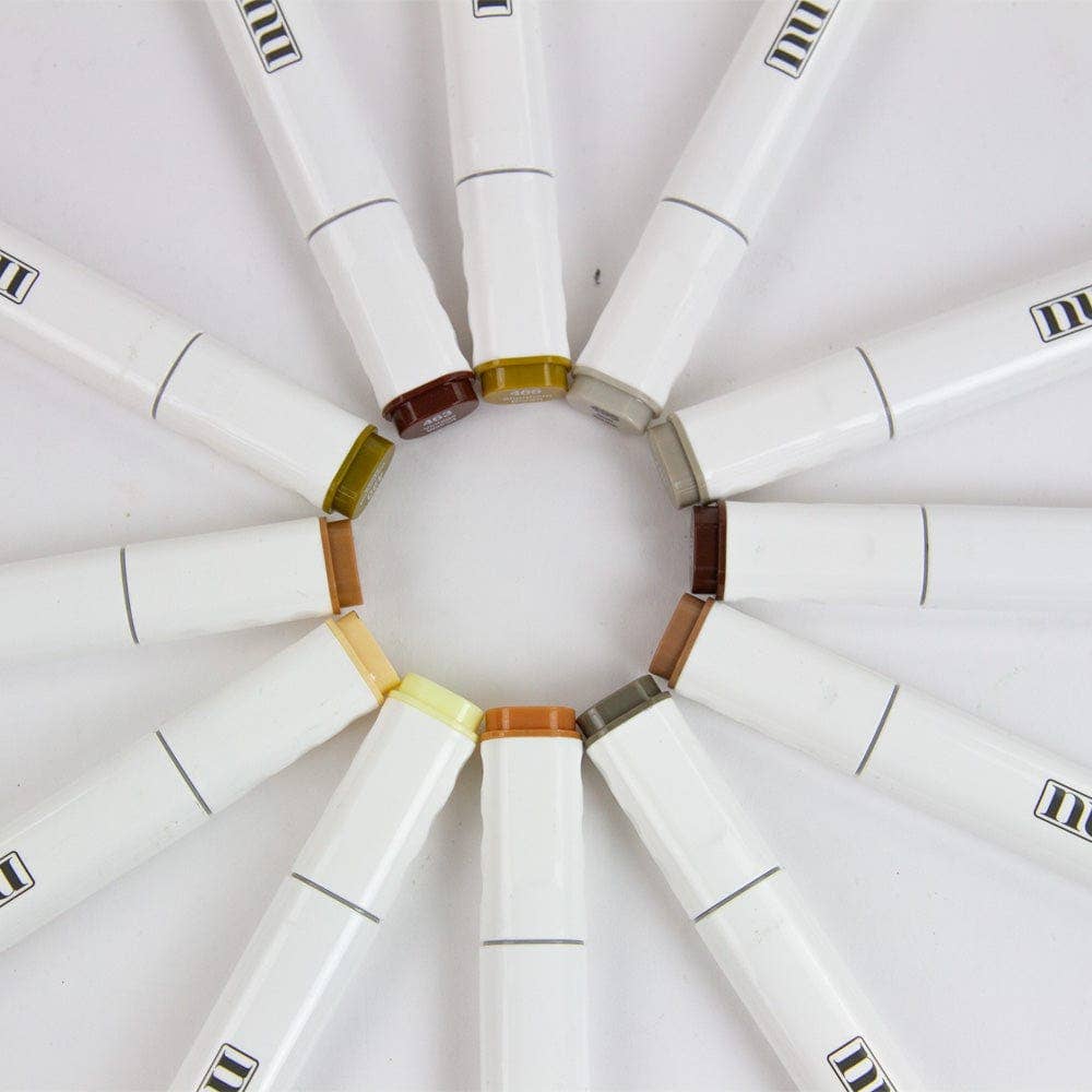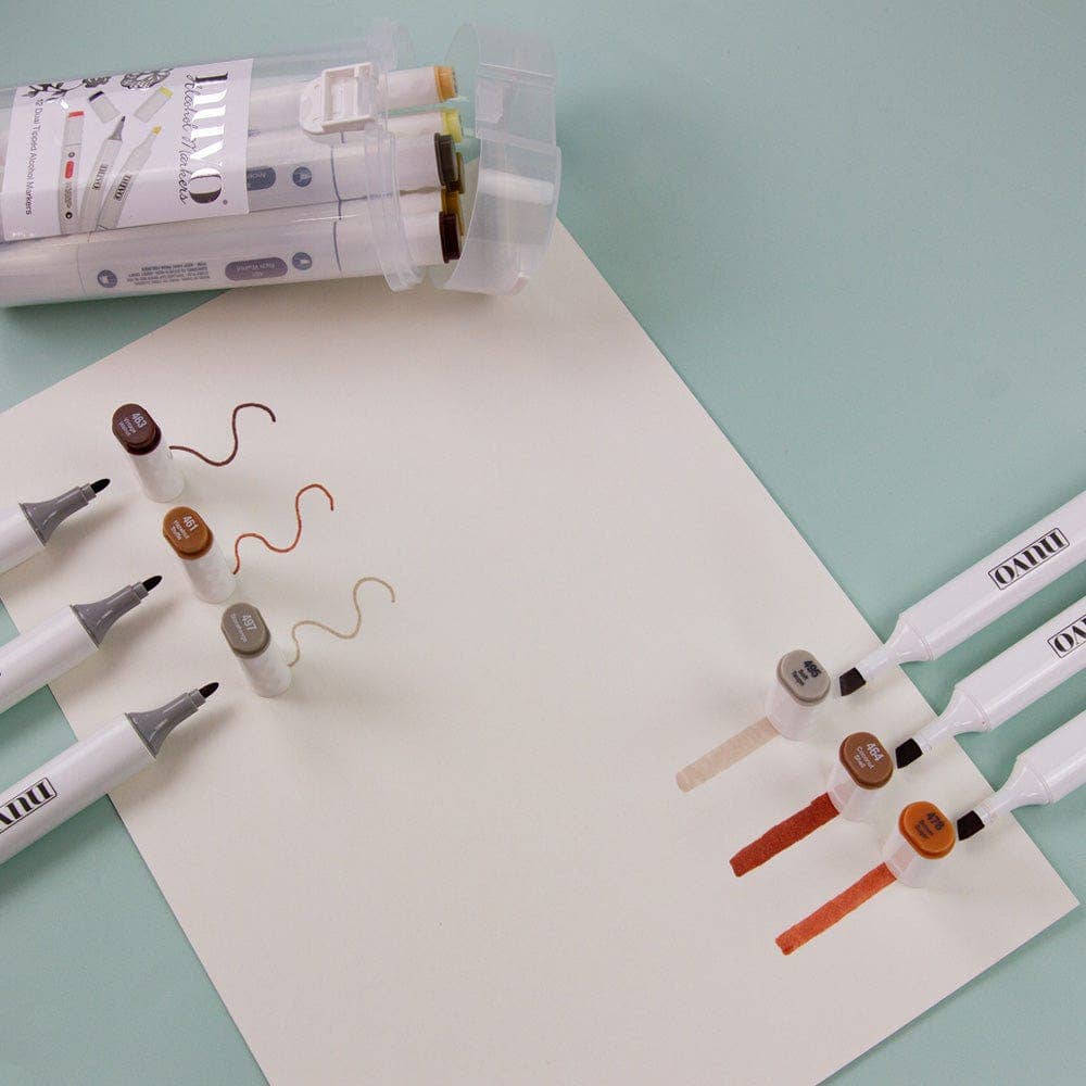Nuvo Alcohol Markers - 12 pack has been thoughtfully put together as our Earth Tones offering brilliantly vibrant colours and are ideal for blending with similar shades or use alongside the Blending Pen to create gradients and other stunning effects.