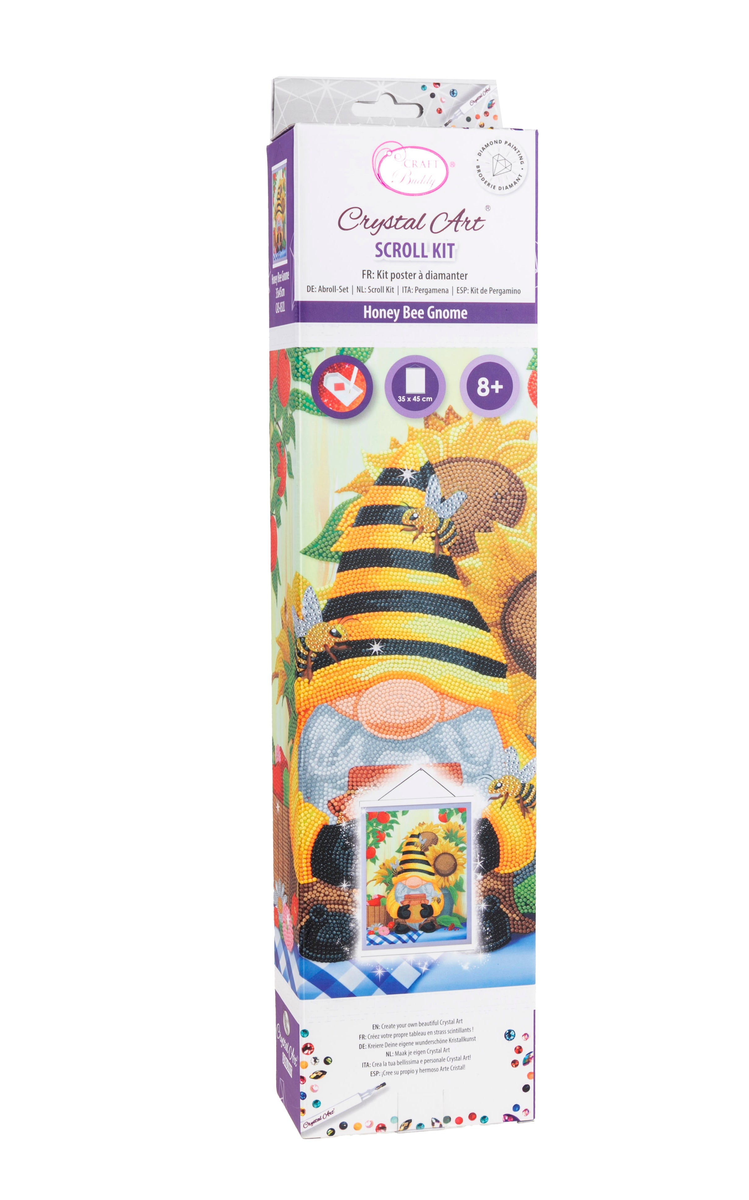 Introducing the adorable "Honey Bee Gnome," a sweet addition to our Crystal Art Scroll line-up. This charming character holds a jar of honey next to a bucket of apples and a bunch of sunflowers on a checked tablecloth. The Gnome is dressed to match his bumblebee friends, with a black and yellow attire, not forgetting his stripey hat!
