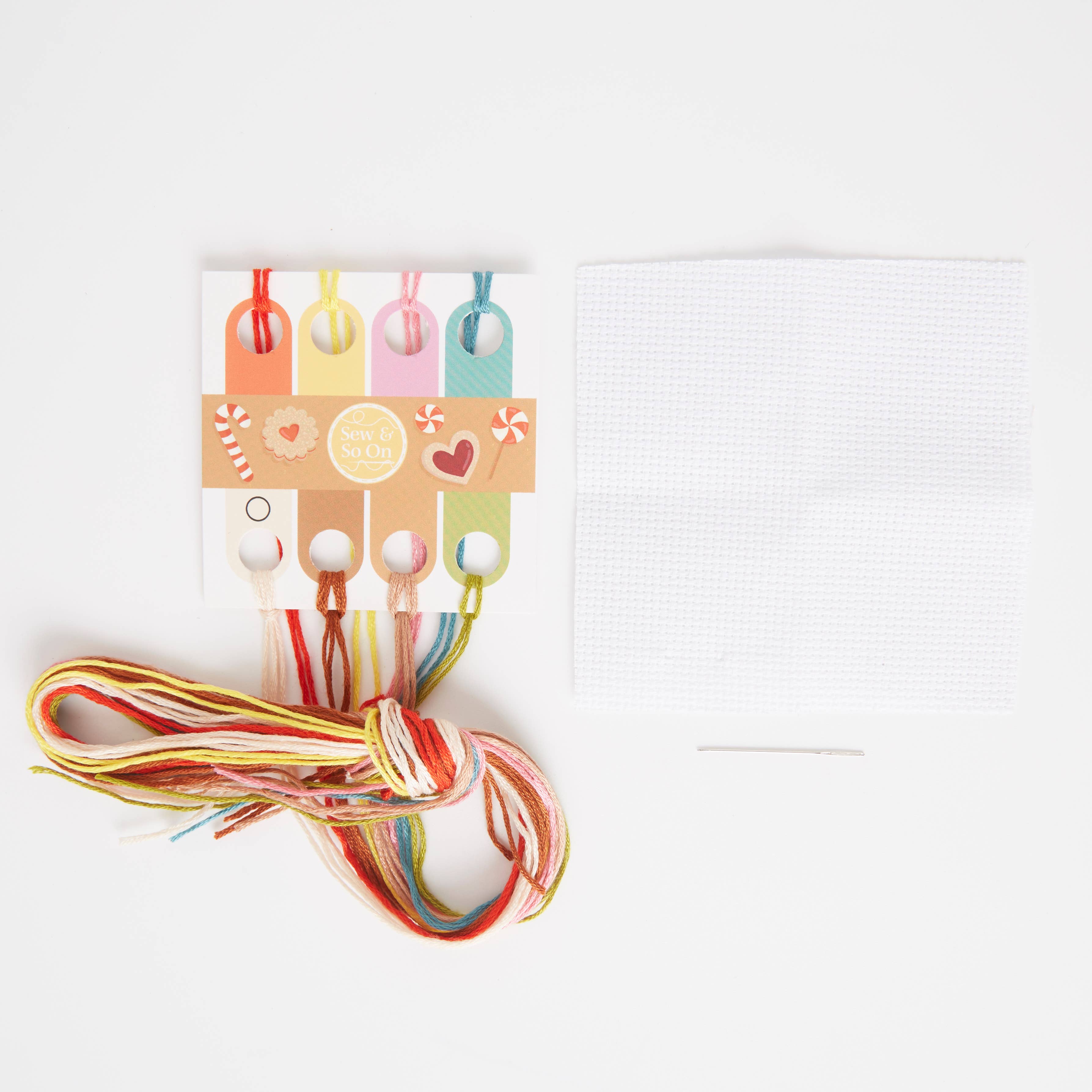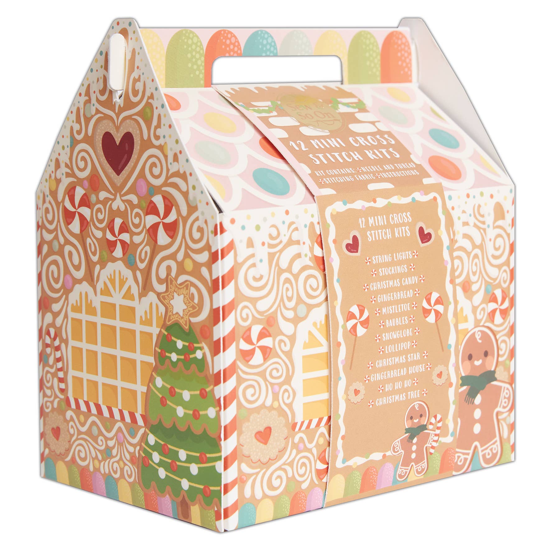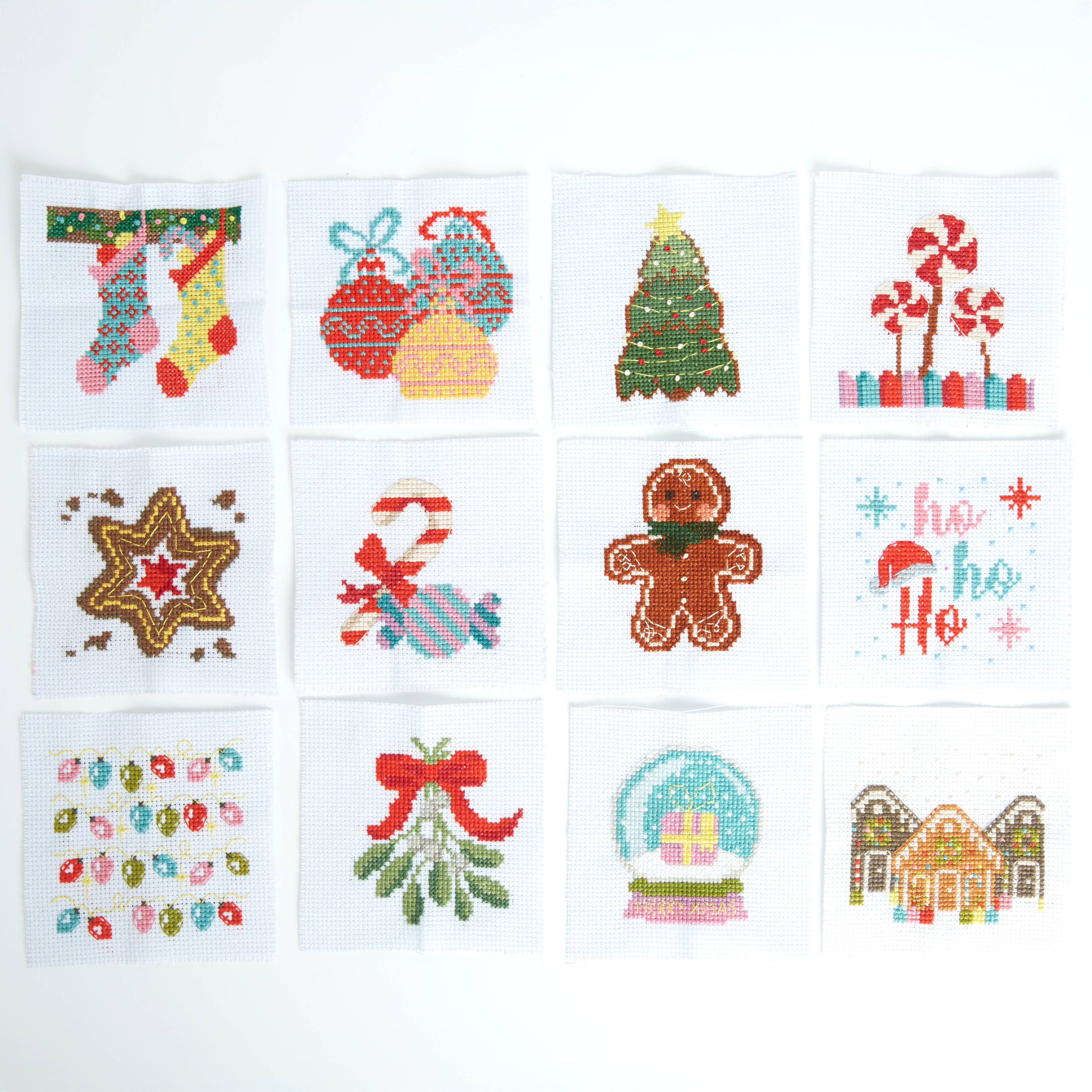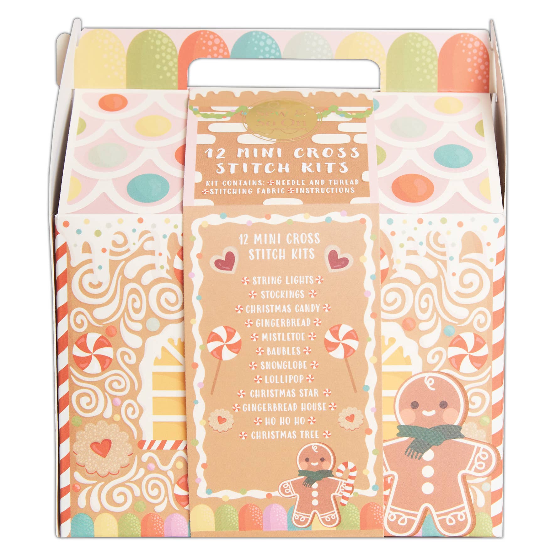 DESIGN This collection of 12 mini cross-stitch designs features a variety of festive designs including Christmas tree, holly, gingerbread man & more, includes coloured thread, needle, embroidery & hoops making it a great craft for a beginner crafter.