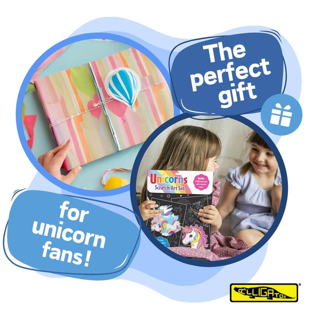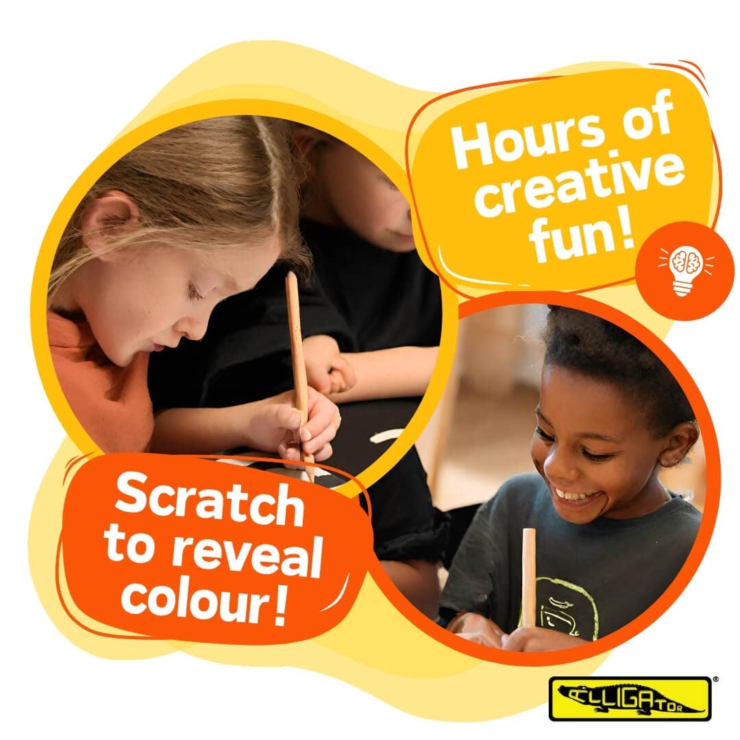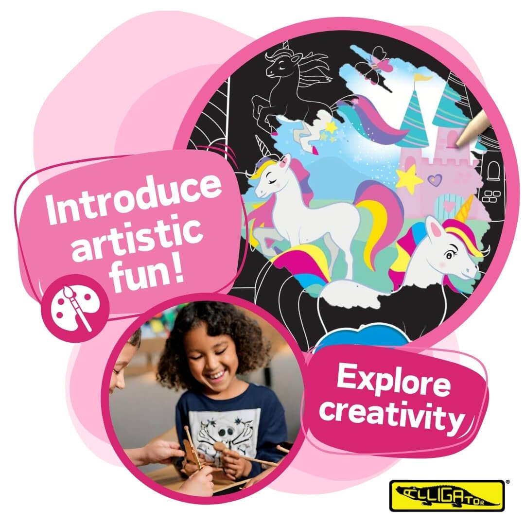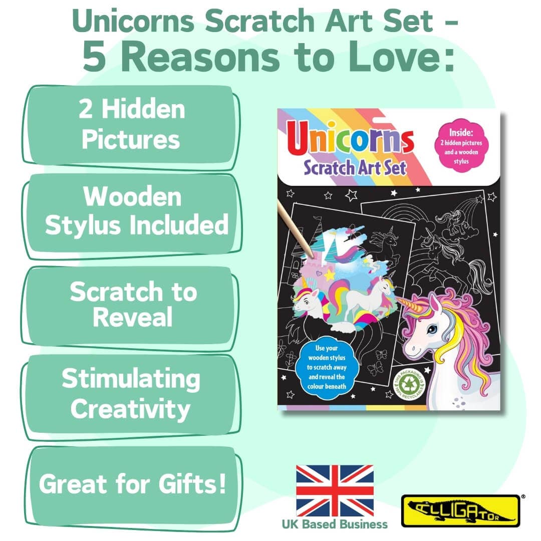 Unleash your inner artist with the Unicorns Scratch Art Set! This fun and creative kit lets you scratch away to reveal two hidden unicorn-themed designs. Simply use the wooden stylus to scratch off the top layer and uncover the vibrant colours and patterns beneath. Get ready for a magical experience as you bring these mythical creatures to life.